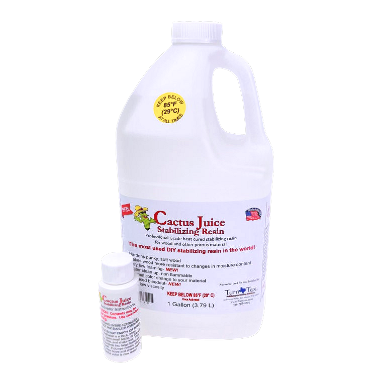 Cactus Juice is a heat cured resin used to harden and stabilize most porous material, especially wood. It comes pre-activated in pints and quarts and ready to activate with the included activator in 1/2 gallon and larger (activating directions). It is quite easy to use and obtain professional results in your home shop following these simple directions.